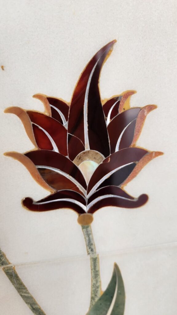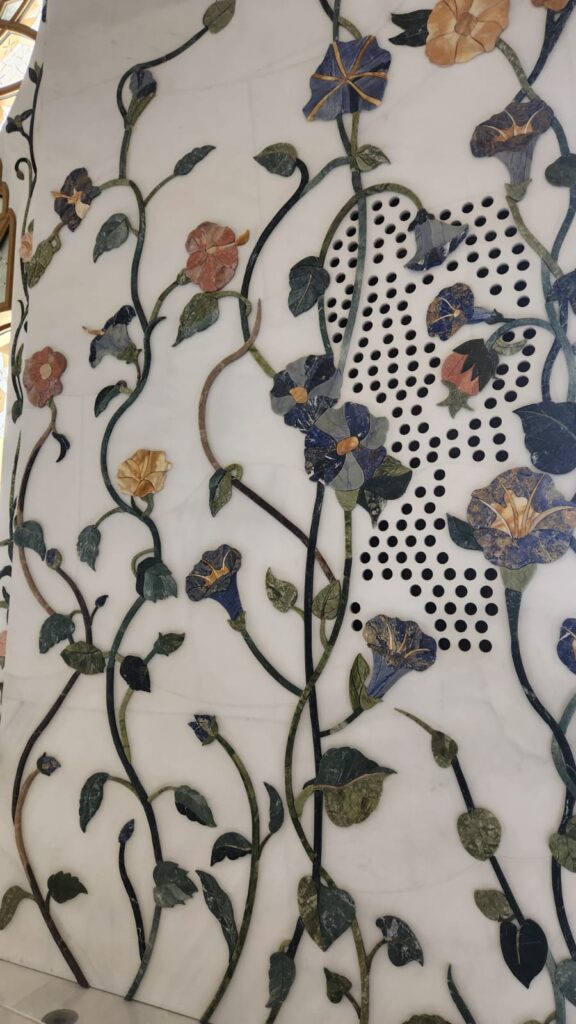 Once inside, one starts noticing the dedication to detail and splendour. The floors and pillars are all inlaid with floral designs in a variety of stone and ceramic.